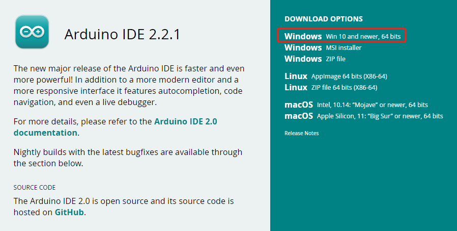 先到 Arduino 官网 下载最新版本 Arduino IDE 的安装包。官方 IDE 支持不同操作系统下载,根据您的操作系统进行选择。这里下载的是 Windows 的,如果已安装,直接跳到第二步。安装过程很简单,一直点击下一步即可。