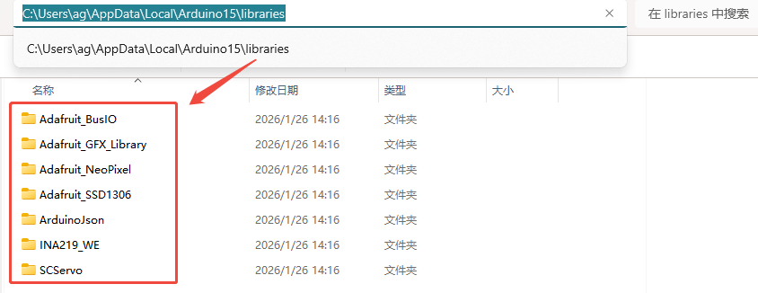 下载 依赖库文件,进行解压缩,打开 Arduino IDE 默认安装位置:C:\Users\username\AppData\Local\Arduino15\libraries(结合自己实际位置),再把图中文件夹复制到 libraries 文件夹里。