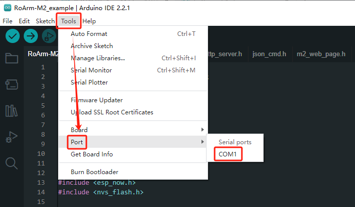 点击“工具”→“端口”,记住自己电脑上已有的 COM,不需要点击这个 COM(此时我这里显示的 COM 为 COM1,不同电脑已有的会显示不一样的 COM)。