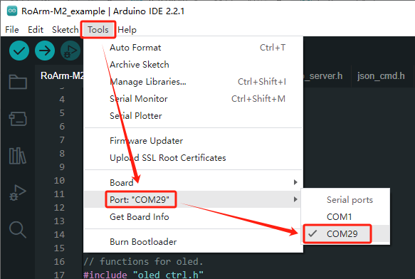用 USB 线将 HexArth 机器人上的驱动板和计算机连接起来(注意要连接左边的 USB 接口),点击“工具”→“端口”,再点击新出现的 COM(我这里新出现的 COM 为 COM29)。