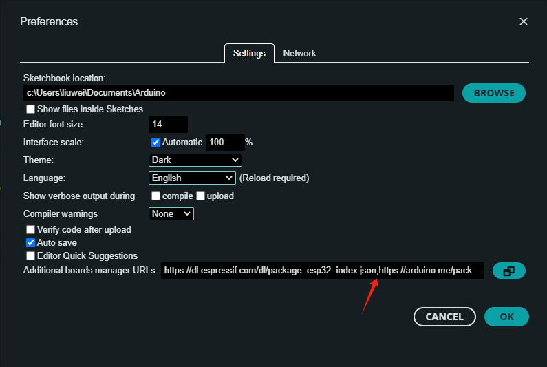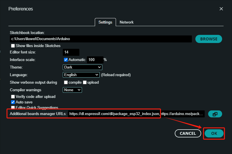 注意如果您需要添加多个开发板 URL,那无需将 ESP32 开发板支持的 URL 删掉,可以直接将其他 URL 添加至另一行,默认显示是逗号分隔开 URL 的。