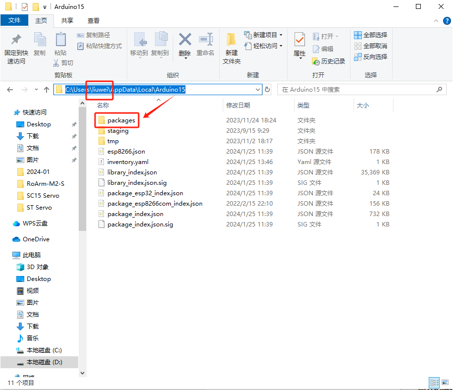 C:\Users\username\AppData\Local\Arduino15username 需要根据自己电脑的用户名更改,新建一个 packages 文件夹,将解压后的文件夹中的 esp32 开发包复制到 packages 文件夹下。