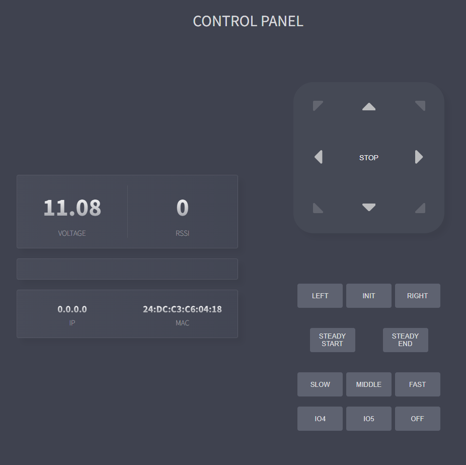 - 这个 Web 端界面会实时显示机器人的电压(VOLTAGE)、STA 模式下的 WIFI 信号强度(RSSI)、IP 和 MAC 地址等信息。