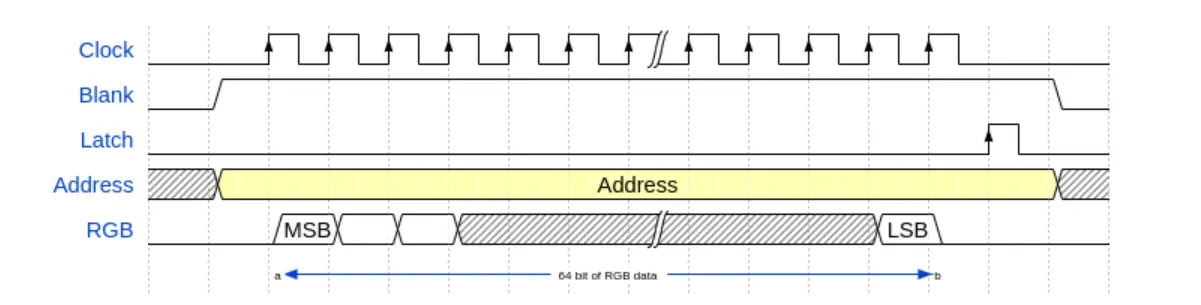 - 3.使用Clock引脚和RGB引脚进行选中的行数据输入。