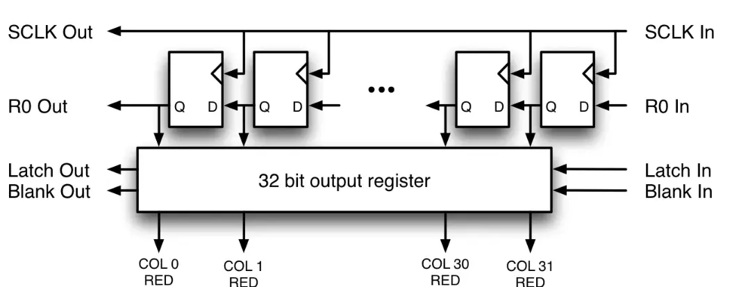 HUB75 的显示数据通过 CLK 驱动移位结构逐位移入,当一行像素数据全部移入后,通过 LAT 将移位结构中的数据锁存到输出寄存器(Latch / Output Register),再由 OE 控制该行的显示使能。数据在级联传输路径中是单向传播的,因此最先输入的数据会被推送到级联链的最远端面板。所以简单总结级联的本质就是共享控制信号(CLK/LAT/OE)并扩展数据传输路径,从而实现对不同数量单元板的统一驱动。
