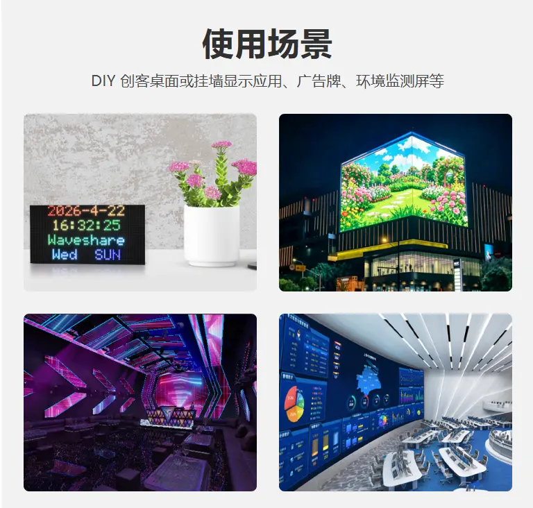 - 通过级联多块显示屏,可搭建更大尺寸的矩阵墙,用于艺术装置或交互装置
