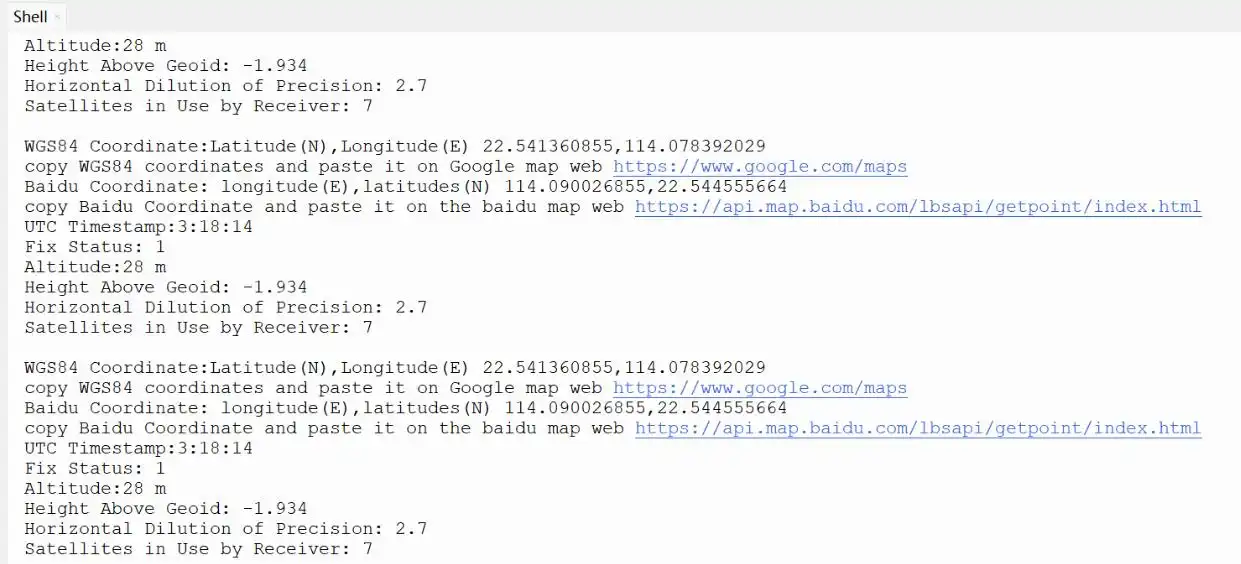 使用 thonny 将 04_GPS_UART 下所有目录和文件上传到开发板,运行 example 文件下的 coordinates_converted.py 文件。