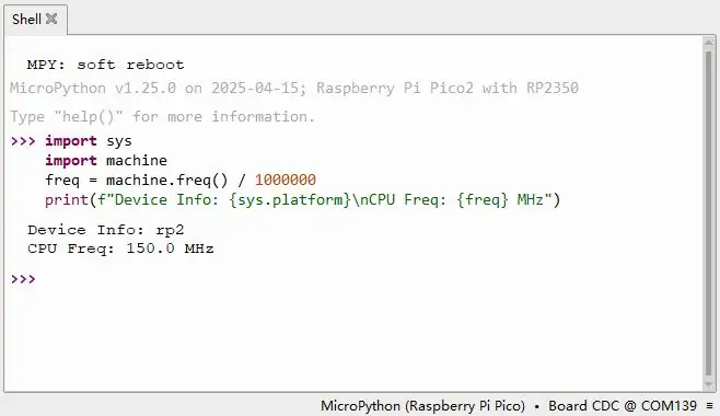 检查提示符:连接成功后,Shell 窗口中应出现 MicroPython 的版本信息、开发板信息和