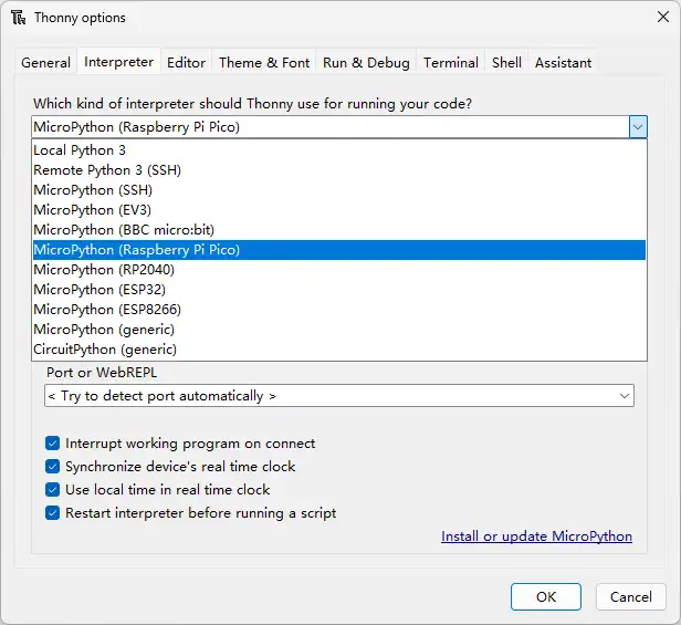Thonny 是一款面向初学者的 Python 集成开发环境 (IDE),其内置了对 MicroPython 的完善支持,可以轻松完成固件烧录、文件管理和代码调试等所有操作。