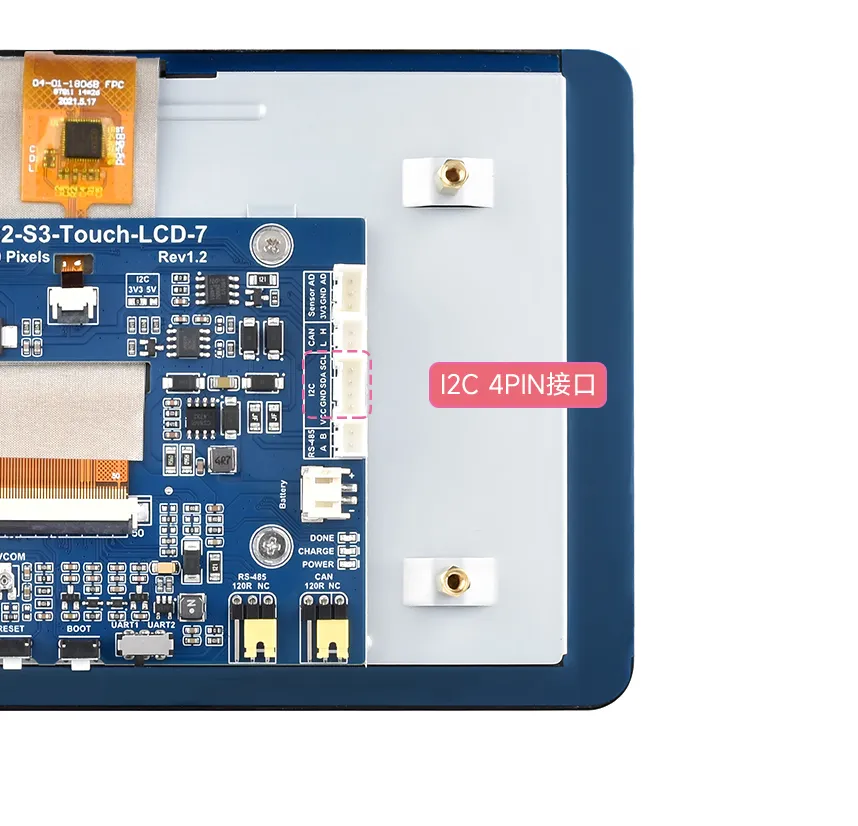 ESP32-S3 芯片当中,具有两个 I2C 控制器,可设置成主机或者从机,并且可以映射到大部分的 GPIO 口上。在 ESP32-S3-Touch-LCD-7 当中我们引出了一个 PH2.0 4PIN 的座子,连接着 ESP32-S3 芯片的 IO8 和 IO9 引脚,方便客户将这两个引脚映射成 I2C 通信接口,用于连接和调试 I2C 接口的设备。
