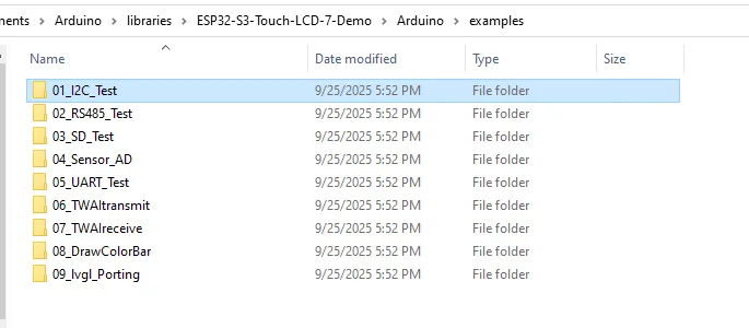 请先从以下地址下载例程包:ESP32-S3-Touch-LCD-7 示例程序 (如果先前已经下载,直接打开对应文件夹即可) 将例程压缩包解压之后,打开对应的 01_I2C_Test 文件夹: