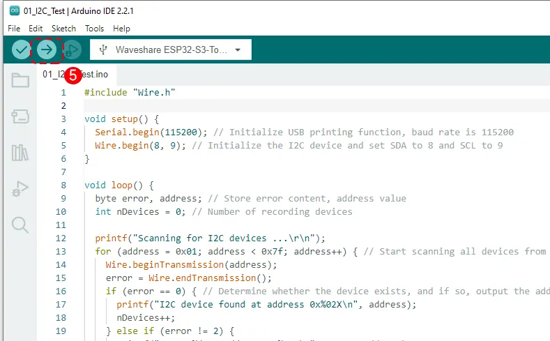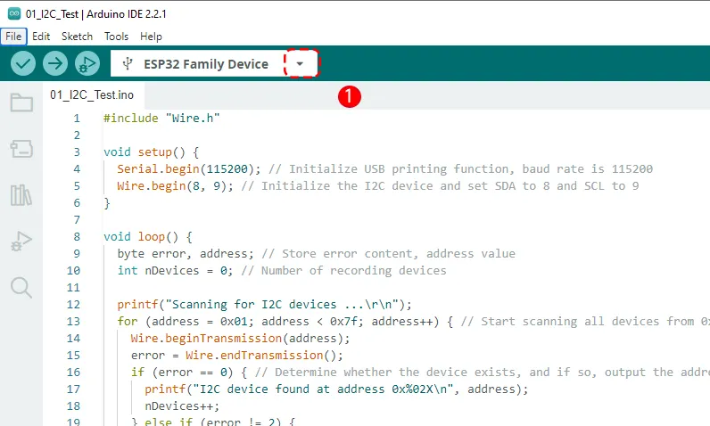 为演示 ESP32 在 Arduino 当中的 I2C 基本驱动方式,我们提供了一个 I2C 地址扫描的例程,方便用户迅速了解驱动步骤。