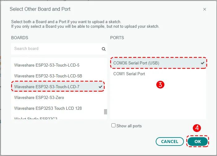 点击这个 COM36 之后会弹出来主板和接口的选项窗口,这里我们选择板子型号为 Waveshare ESP32-S3-Touch-LCD-7,接口是 COM36 Serial Port (USB),然后点击右下角的 OK 按键进行确认。