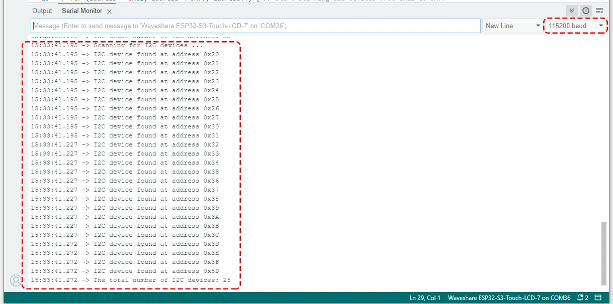 设置合适的波特率(115200),程序运行之后,串口监视器将显示 "Scanning for I2C devices ..." 的信息,后面跟着的地址就表示该 I2C 设备的地址。