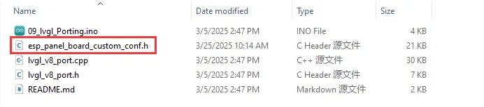 请先从以下地址下载例程包:ESP32-S3-Touch-LCD-7 示例程序 (如果先前已经下载,直接打开对应文件夹即可) 将例程压缩包解压之后,打开对应的 09_lvgl_Porting 文件夹: