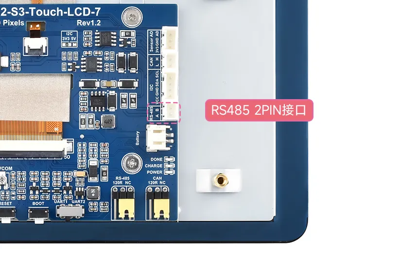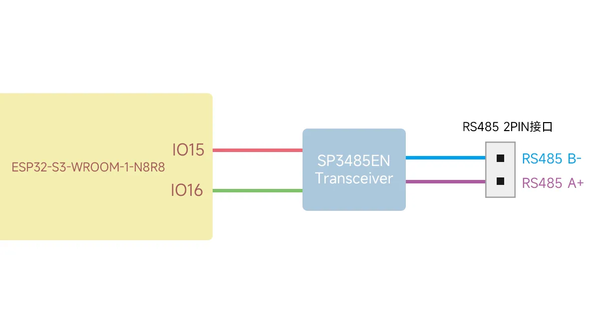 在本产品当中,我们将 ESP32-S3 的 IO15 和 IO16 分别作为 RS485 的 TX 引脚和 RX 引脚,连接到了 SP3485EN 收发器,并引出了一个 PH2.0 2PIN 的座子,可供客户连接到各种 RS485 的设备进行通信和控制。