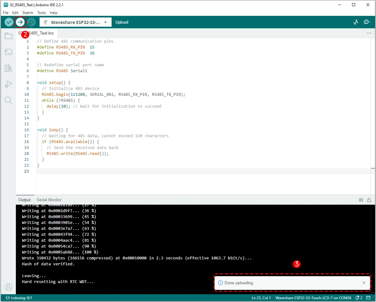 向 ESP32-S3 的 RS485 串口发送 waveshare,程序读到之后立马会向电脑端返回相同的字符,从而实现了一个简单的 RS485 收发过程。