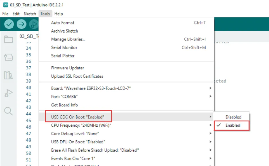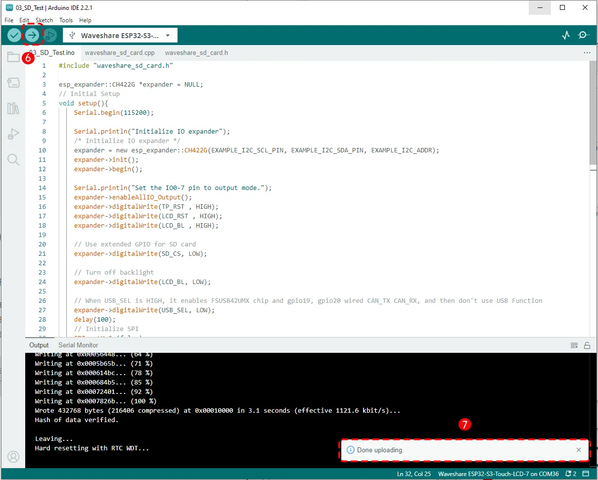 在上传程序之前需要选择好主板的型号 Waveshare ESP32-S3-Touch-LCD-7 和对应的端口: